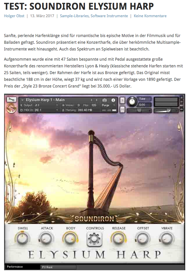 "Elysium Harp ist vom Sound über die Ausstattung mit Klang- und Spielvariationen bis hin zur gelungenen Oberfläche und der einfachen Bedienung die derzeit beste Harfe am Markt. Sie eignet ich für Filmmusik und artverwandte Genres, kann auch mittelalterliche Motive veredeln oder in Balladen als zartes, liebliches Melodieinstrument eingesetzt werden. Hier stellt sie eine Alternative zur Gitarre dar."