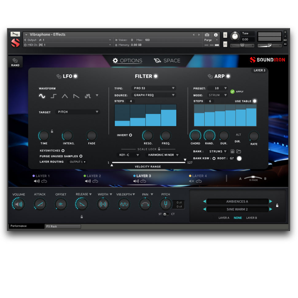This 24GB virtual instrument is perfect for soundtrack scoring, cinematic effects, modern jazz and avant garde compositions, and any style of music that calls for long-sustaining richly tonal, eclectic and lush-sounding tuned percussion. We placed our microphones exceptionally close to capture an unmatched level of deeply-nuanced resonance and character. Each preset makes creation easy with our advanced feature set, providing you with four intuitively-shapable independent sonic layers so you can build and sculpt your own sound. Each layer module includes an independent articulation selection, arpeggiator, filter system, LFO and shaping controls, as well as its own fully-customizable variable motor speed, so you can smoothly sweep from absolutely steady to total vibrato. This allows you to layer and combine multiple articulations and sound-designed textural elements to create your own unique instruments.