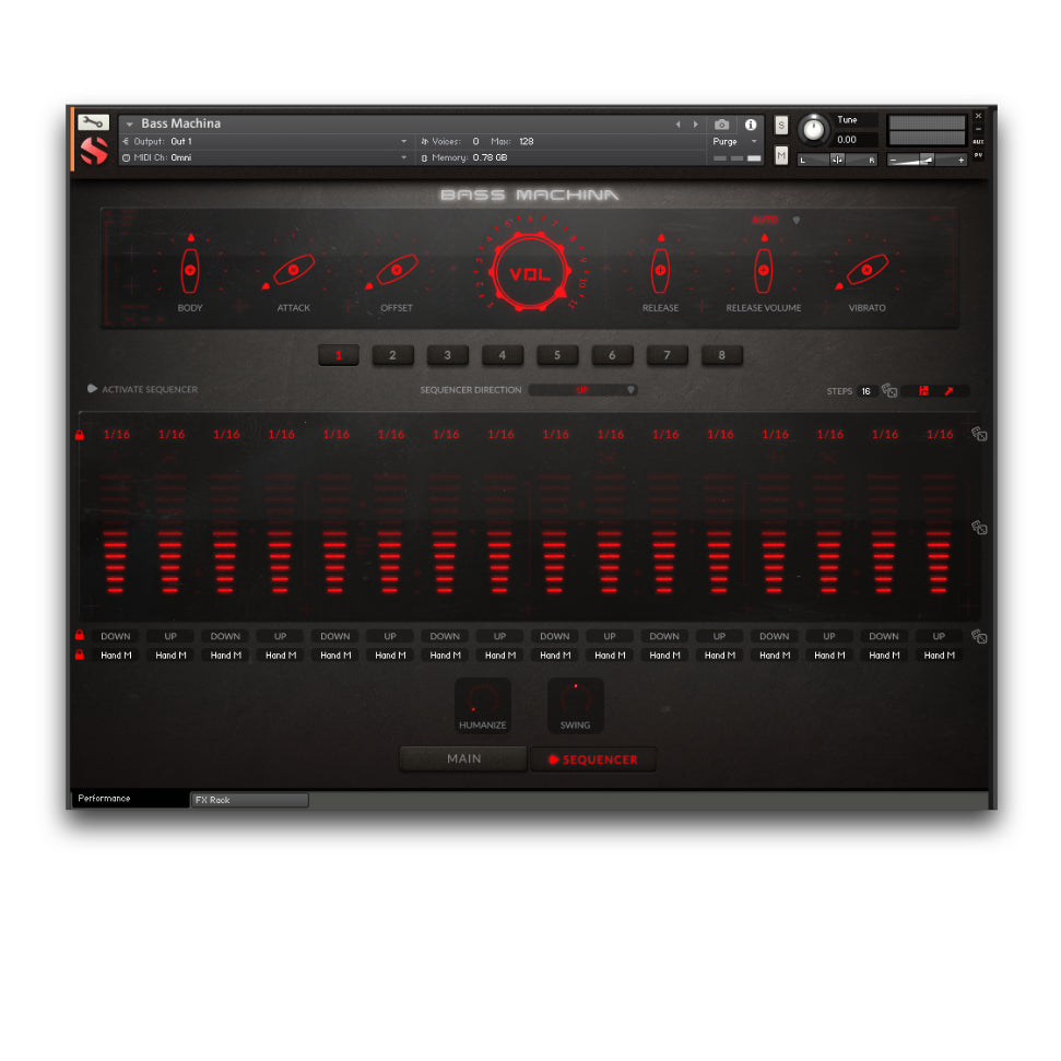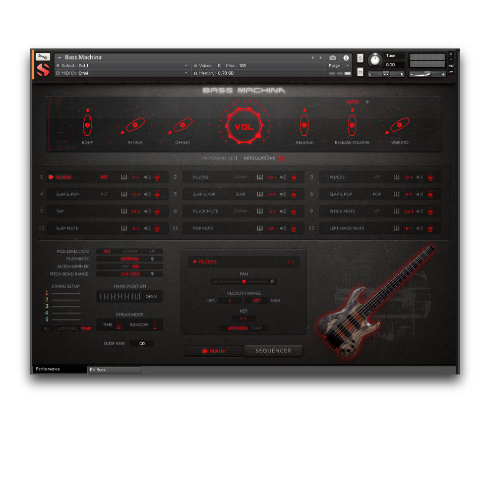Captured with pristine detail, Bass Machina features pick sustains, taps, slaps, pops, and mutes, plus programmable slides at various tempos, and full control over hammer-ons and pull-offs for fluid and realistic performances. Shape your sound with raw D.I. recordings, ready to be run through your favorite amp sims and plugins. The intuitive and fully customizable UI gives you real-time articulation switching, advanced mapping options, a powerful sequencer, auto-strummer, sequencer, and a full FX rack—everything you need to build devastating basslines with precision and power.